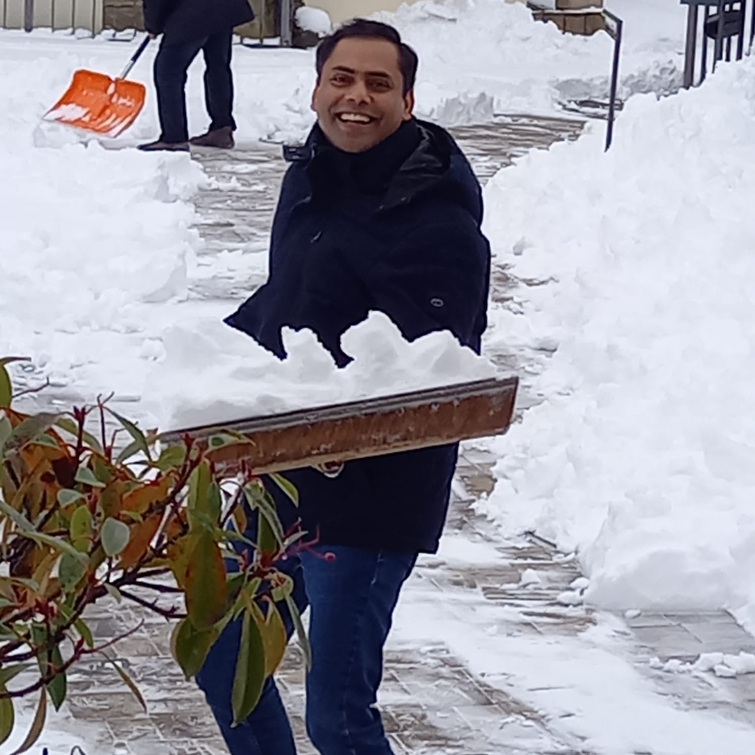 Pfarrer Bince Joseph beim Schneeschippen im Pfarrgarten….