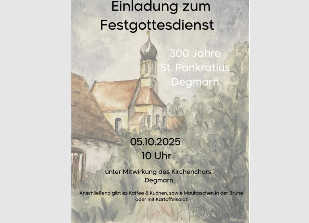300 Jahre sind ein stolzes Alter unserer Degmarner St. Pankratiuskirche. Wir feiern mit einem Festgottesdienst am Sonntag den 5. Oktober um 10h unter Mitwirkung des Kirchenchores Degmarn. Anschließend gibt es Kaffee und Kuchen, sowie Maultaschen in der Brühe oder mit Kartoffelsalat.